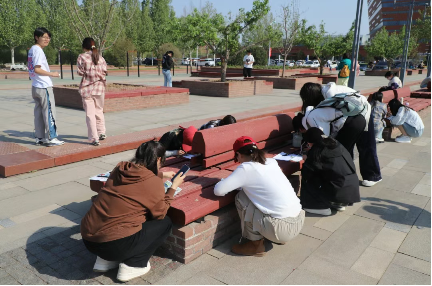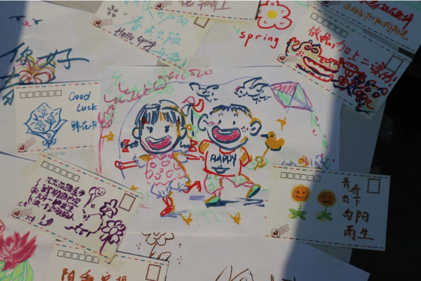 寻花打卡活动后,同学们来到体育中心南广场席地而坐,或画板彩绘、或DIY手环、或撰写明信片、或制作书签,通过不同的方式表达自己对于校园初夏美景的印象。