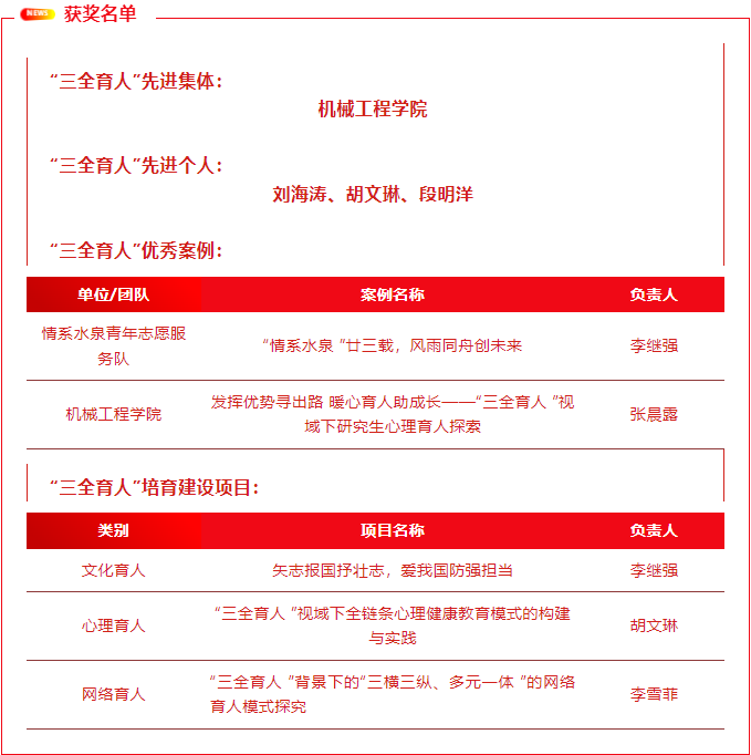 为全面贯彻立德树人根本任务,切实提升新形势下高校思想政治工作质量,调动广大教职员工全员全过程全方位育人的积极性,学校开展“三全育人”先进集体、先进个人、优秀案例和培育建设项目评选活动,机械工程lejing乐竞体育(中国)官方网站-登录入口积极组织lejing乐竞体育(中国)官方网站-登录入口教师申报,经学校评审获奖名单如下: