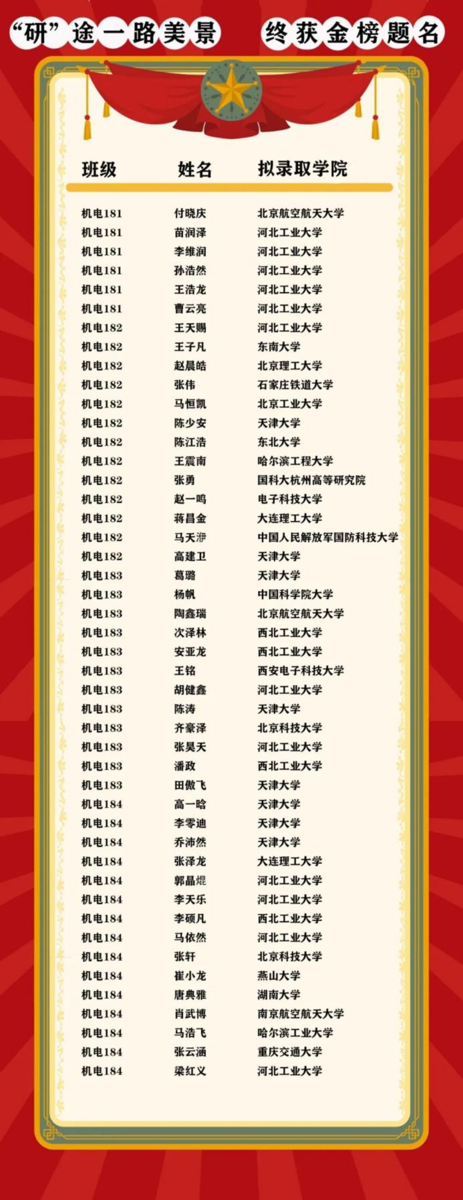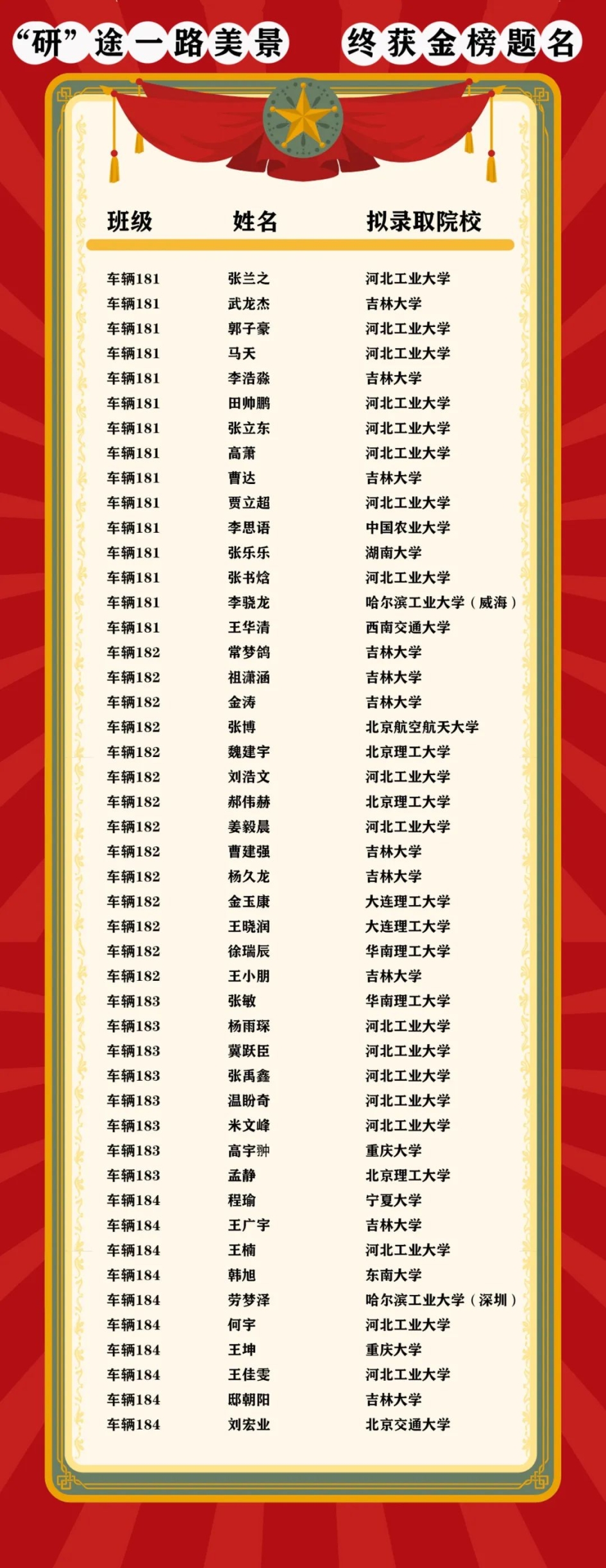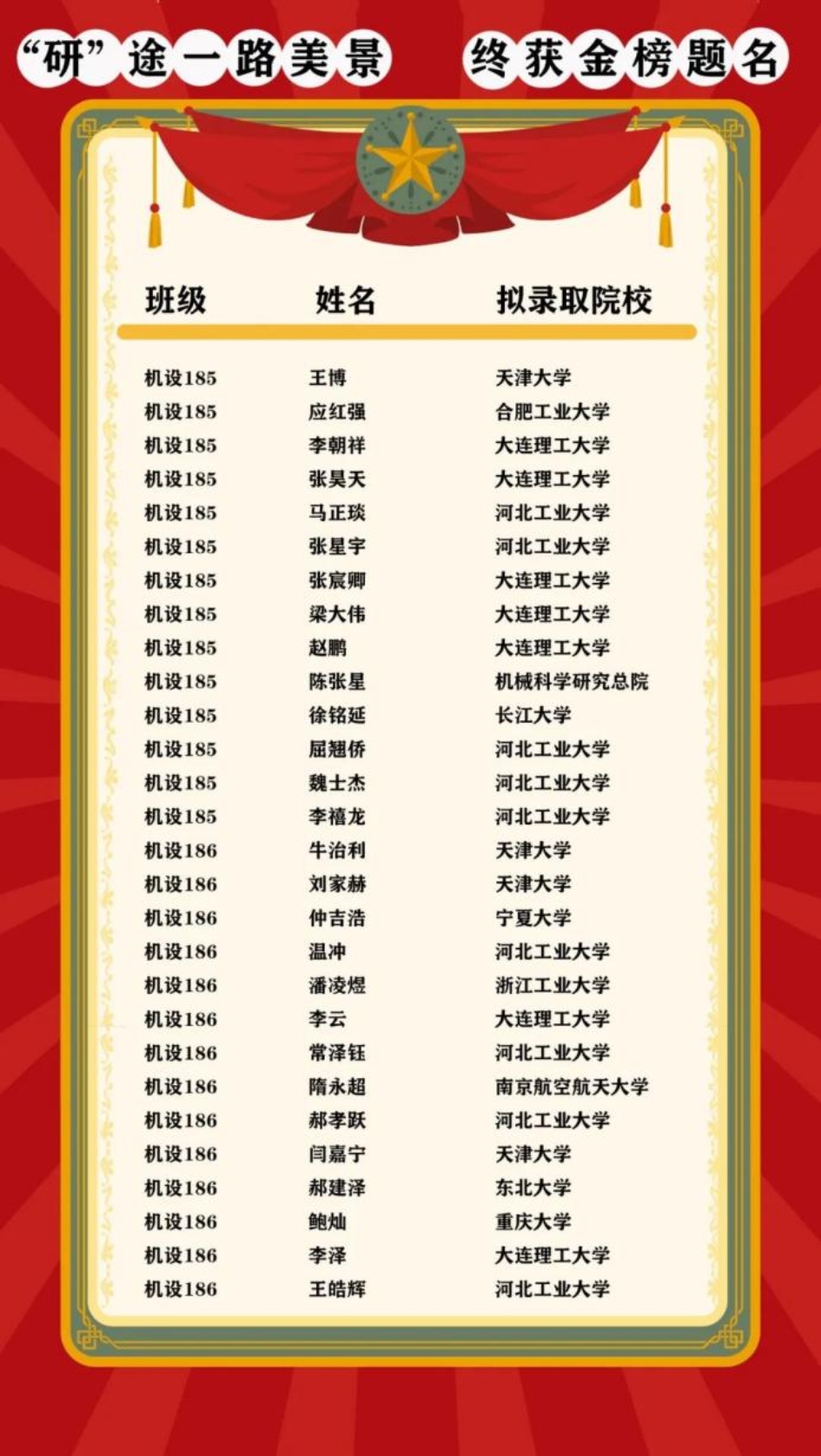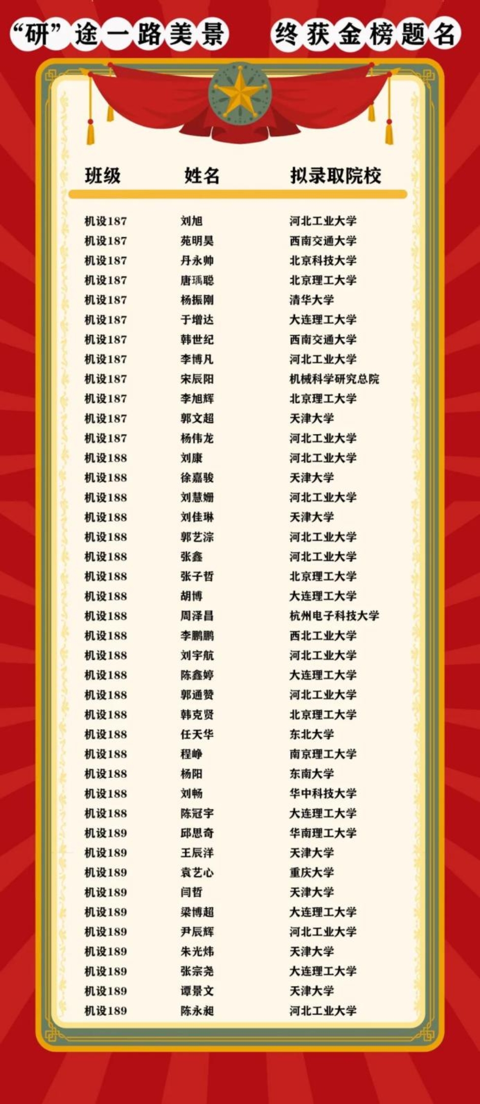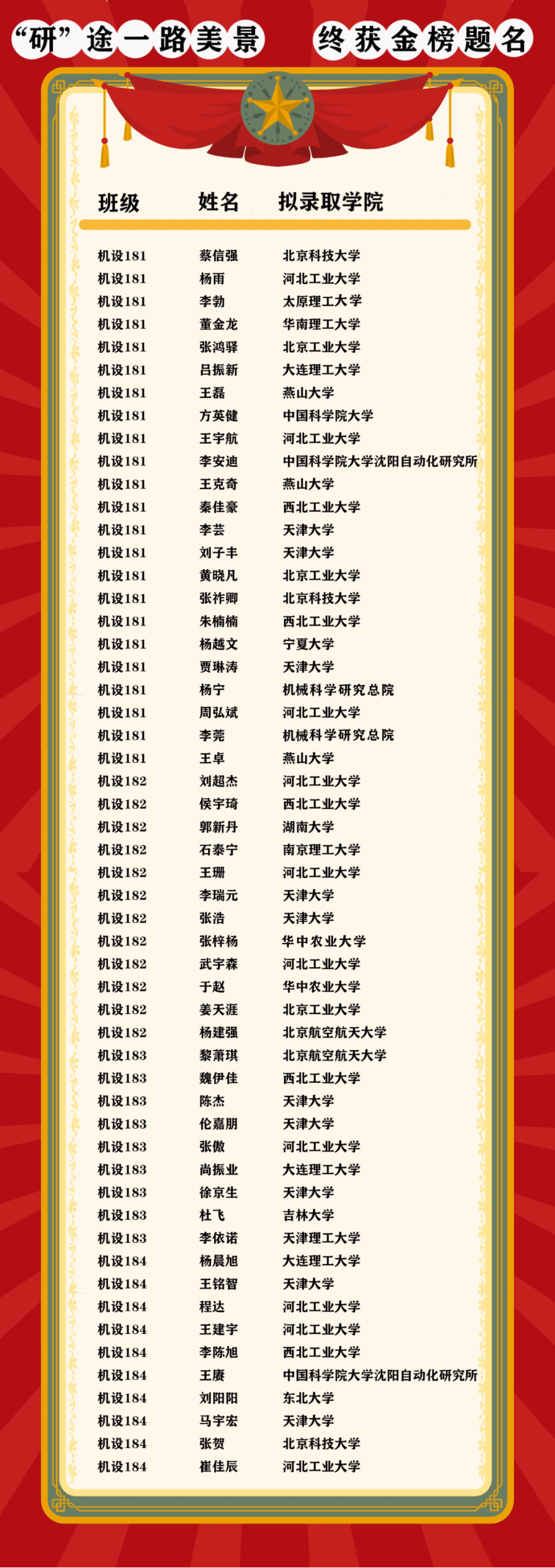 考研是一场逆流而上的旅行,是一次孤独的朝圣。目及朝霞,身披星光,昼夜兼程,四年的朝朝暮暮换来一朝金榜题名。今年机械工程lejing乐竞体育(中国)官方网站-登录入口再创佳绩、喜报连连,让我们一起恭喜这 名考(保)研学子成功上岸!