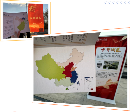 打卡活动以中国人民解放军五大战区为背景,精心设置了五个闯关打卡点位,参与者在首个点位领取出征状,按指引顺序前往各个打卡点,在各点位学习五大战区相关国防知识,答题正确即可获得贴纸1张,最终集齐五大战区贴纸视为打卡成功。活动终点处设有主题绕绳活动,同学们用绳线将个人专业、家乡、发展目标与所在战区连绕在一起,直观感受国家安全与个人发展的紧密联系。