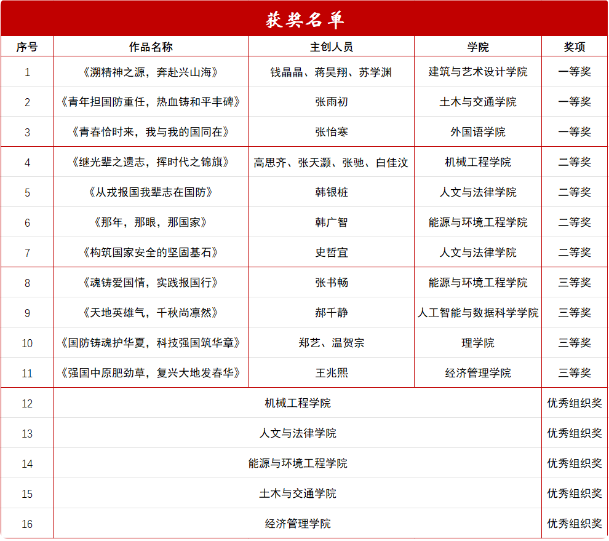通过为期一个月的国防演讲主题活动,营造了关心国防、热爱国防、积极投身国防建设的浓厚氛围,坚定了理想信念,激发了河工学子为国家的繁荣富强和民族复兴伟业贡献青春力量的担当与使命!