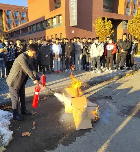 在消防安全培训过程中,陈老师针对灭火器的使用方法做了教学演示。随后,师生们对于易燃物着火进行了实地演练,帮助大家将消防知识理论转化为实践训练,为同学们增添了实际灭火的经验,进一步保障了校园安全。