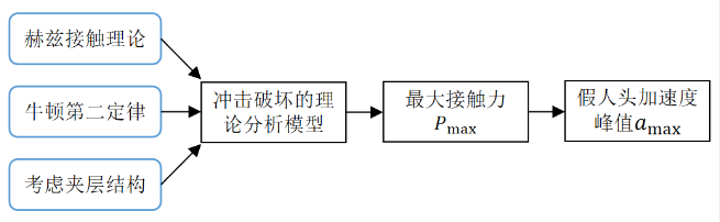 根据赫兹弹性碰撞理论,头部模型和挡风玻璃可以简化为球体。头部模型的质量为m1,半径为r1,而挡风玻璃的质量和曲率半径分别为m2和r2。如图3所示,头部模型碰撞冲击速度为v。基于牛顿第二定律并考虑风窗玻璃夹层结构刚度,推导获得头部模型冲击风窗玻璃不同部位加速度峰值,与试验相比误差在10%以内,可用于汽车车身设计方案早期快速评估中。