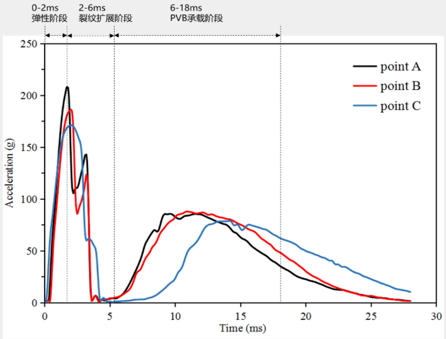 依据 C_NCAP 规定的行人头部碰撞试验要求进行。试验系统主要包括发射装置、成人头部模块、光电测速系统、高速摄像机等。第Ⅰ阶段:产生弹性变形,玻璃没有损伤,结构整体刚度较大,曲线线性增长,迅速达到峰值;第Ⅱ阶段:先产生径向裂纹,在径向应力作用下生成圆形裂纹,裂纹扩展,曲线下降趋势;第Ⅲ阶段:PVB的吸能缓冲作用,使得风挡玻璃能持续承受载荷,曲线先上升后逐渐下降。