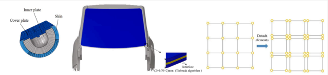 头部模型由一层皮肤、一个覆盖板和一个内板组成,均采用六面体单元进行网格划分。此外,汽车模型包含与测试中涉及的挡风玻璃相关的组件。挡风玻璃的玻璃层使用28572个六面体单元进行网格划分,中间的PVB层使用14286个六面体单元进行网格划分。为了实现PD算法,将相邻玻璃单元连接处的节点分离,获得近场动力学使用的不连续单元。考虑到夹层玻璃粘接作用失效后的界面剥离现象,模拟了上下层玻璃与中间层PVB膜的粘接作用,如图5所示。图6和图7所示为头部冲击风挡玻璃裂纹演化的分析结果,头部HIC的仿真与试验误差在10%以内。
